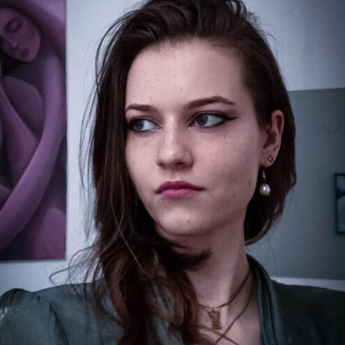 Lea Terletzki is a contemporary artist whose work fuses mythic symbolism with modern storytelling. Known for expressive, layered compositions and a signature use of gold and geometric framing, Lea explores themes of transformation, identity, and the interplay between light and shadow.Based in Potsdam, Lea shares not only their art but also their personal journey and creative lifestyle with a growing audience on Instagram. Their feed is a window into the artist’s world — studio rituals, city wanderings, memories and the everyday inspirations that fuel their practice.Since 2025, Lea started working at Galerie Grolman in Berlin, marking a new chapter in their engagement with the art scene. Whether through intimate portraits or mythic tableaux, Lea invites viewers to step into a world where ancient stories and contemporary life intertwine.
